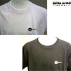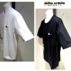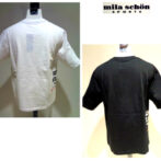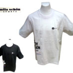 mila schon(ミラショーン)春夏/2024/ロゴプリン 半袖Tシャツ/ブラック・ホワイト/50(LL)・48(L) サイズ/綿100%/中国製/大きいサイズ/セレクトショップ 紳士の高感ベターゾーン&イタリアンスポーツ サラットしてやや厚地の綿生地に各所に施された大きなブランドロゴプリントデザインの半袖カットソー。 肌触り良いコットン生地でスポーティなTシャツです。